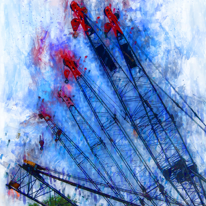 A contemporary colorful abstract painting with a collection of cranes on a blue background.