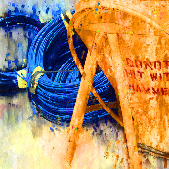 A contemporary colorful abstract painting featuring a yellow concrete dump bucket and blue post tensioning cables.