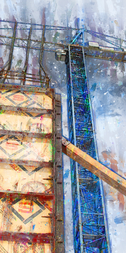 A contemporary colorful abstract painting with a tower crane in blue and a set of concrete forms with reinforcing bar.