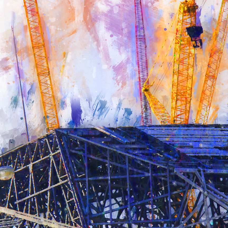 A contemporary colorful abstract painting with a construction site with blue steel red and yellow cranes.