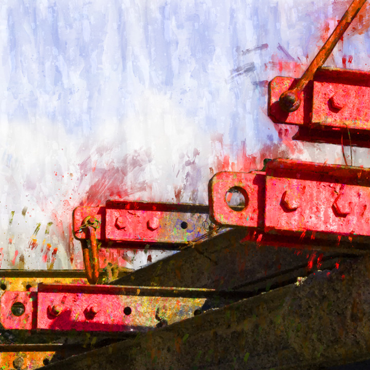 A contemporary colorful abstract painting with concrete form supports with magenta details.