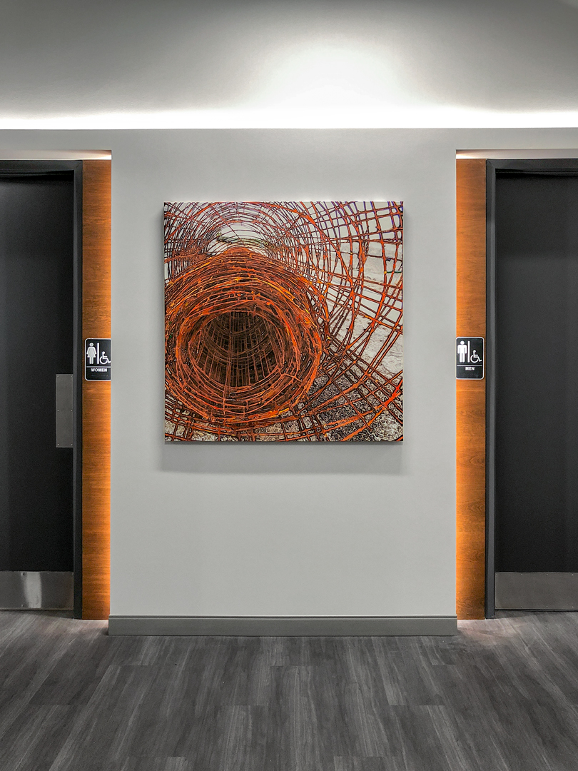A contemporary colorful abstract painting with concrete reinforcing mesh.