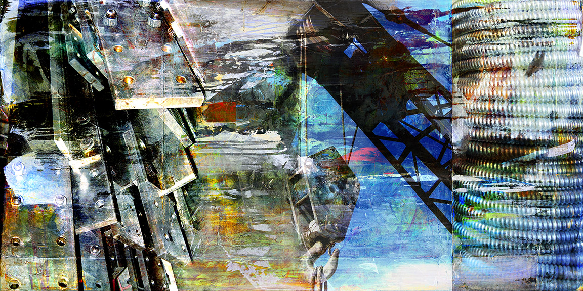 A contemporary colorful abstract painting with construction site with flexible conduit, steel and crane.