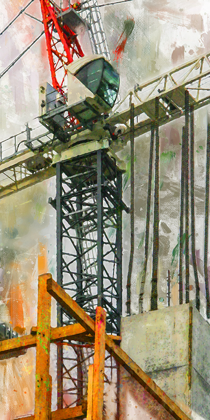 A contemporary colorful abstract painting with a tower crane and column with reinforcing bar.