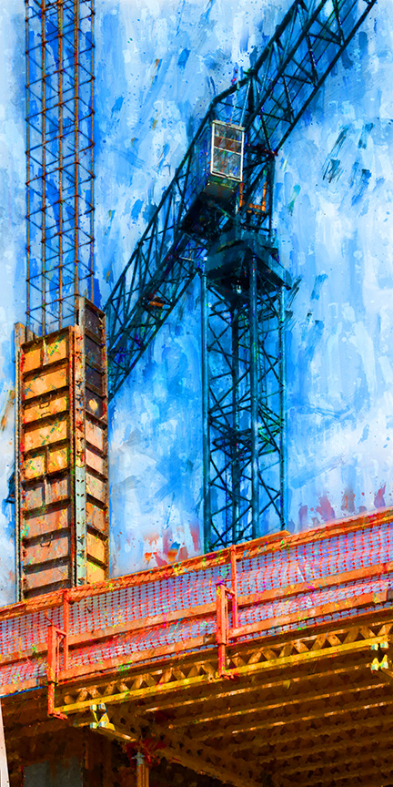 A contemporary colorful abstract painting with a tower crane concrete forms and reinforcing bar against a blue sky.
