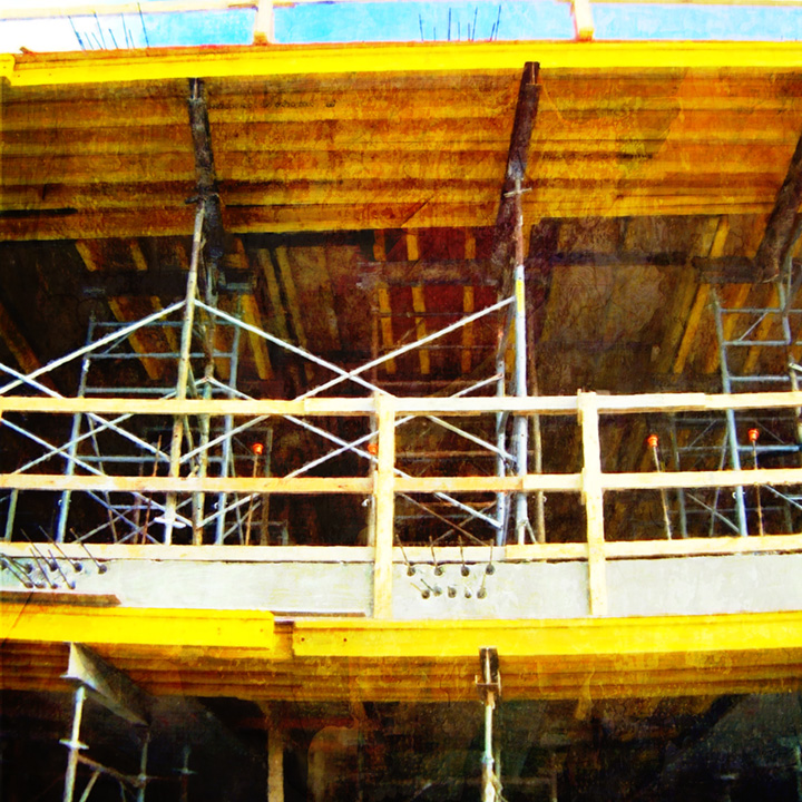 A contemporary colorful abstract painting with concrete forms and reinforcing bar.