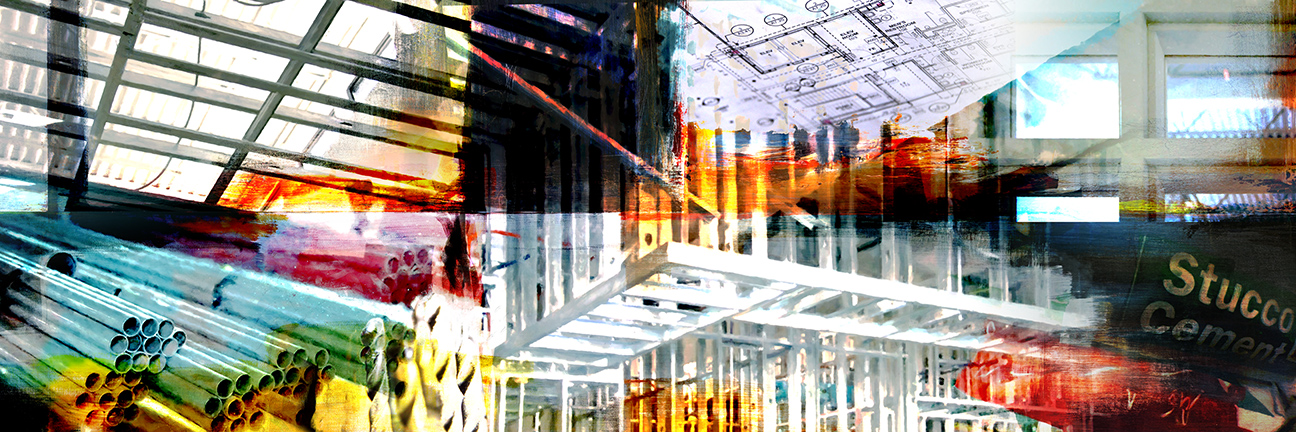 A contemporary colorful abstract painting with construction plans, materials, metal studs, conduit, ceiling grid.