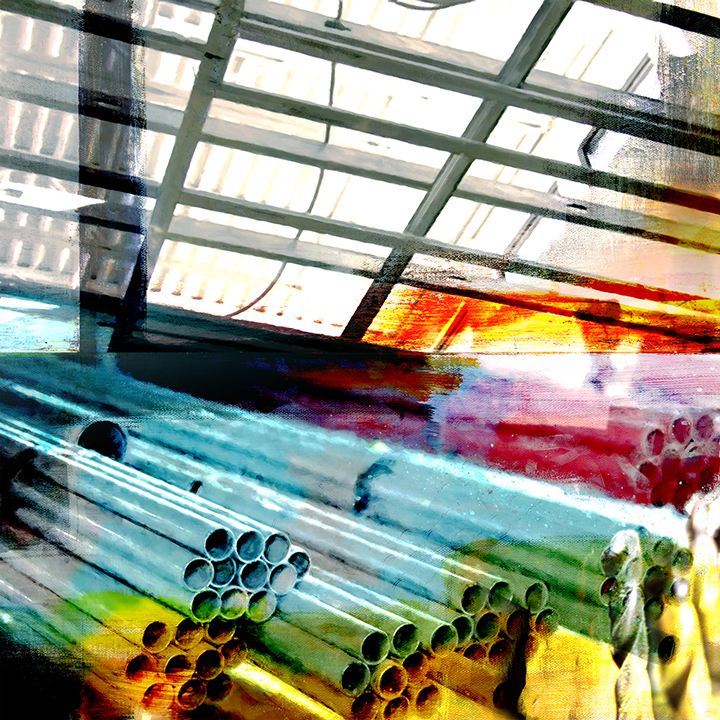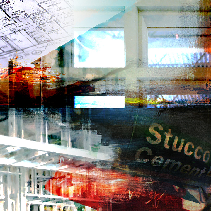 A contemporary colorful abstract painting with construction plans, materials, metal studs, conduit, ceiling grid. Artwork also available as three separate 1:1 ratio panels - call for pricing.