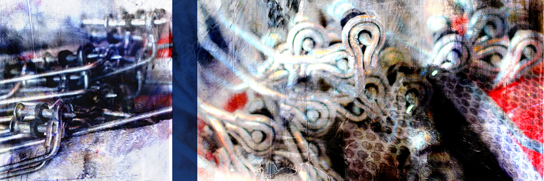 A contemporary colorful abstract painting of construction hardware including suspended ceiling wires.