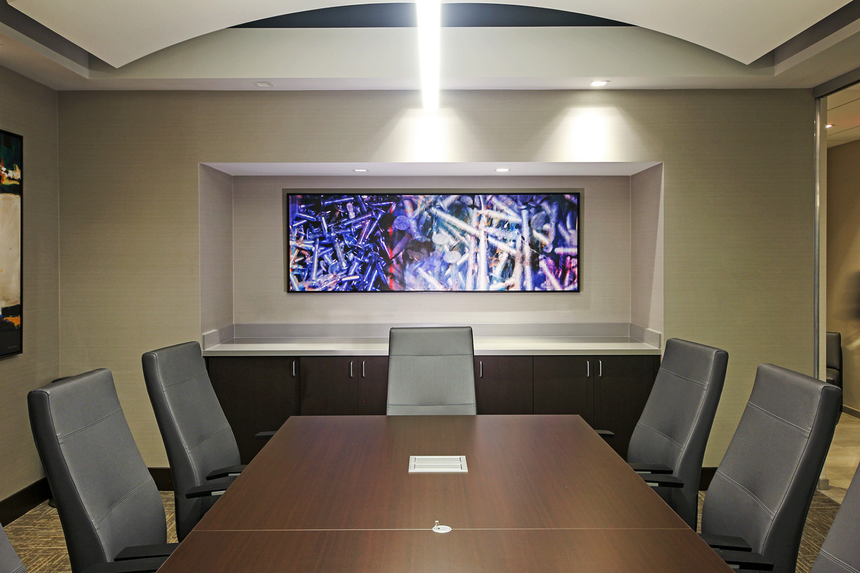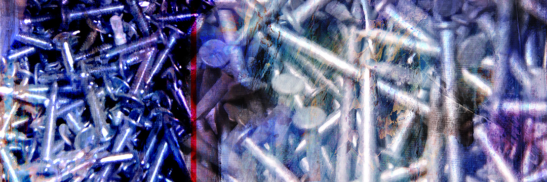 A contemporary colorful abstract painting of nails and various construction fastners, etc. on panoramic abstract.