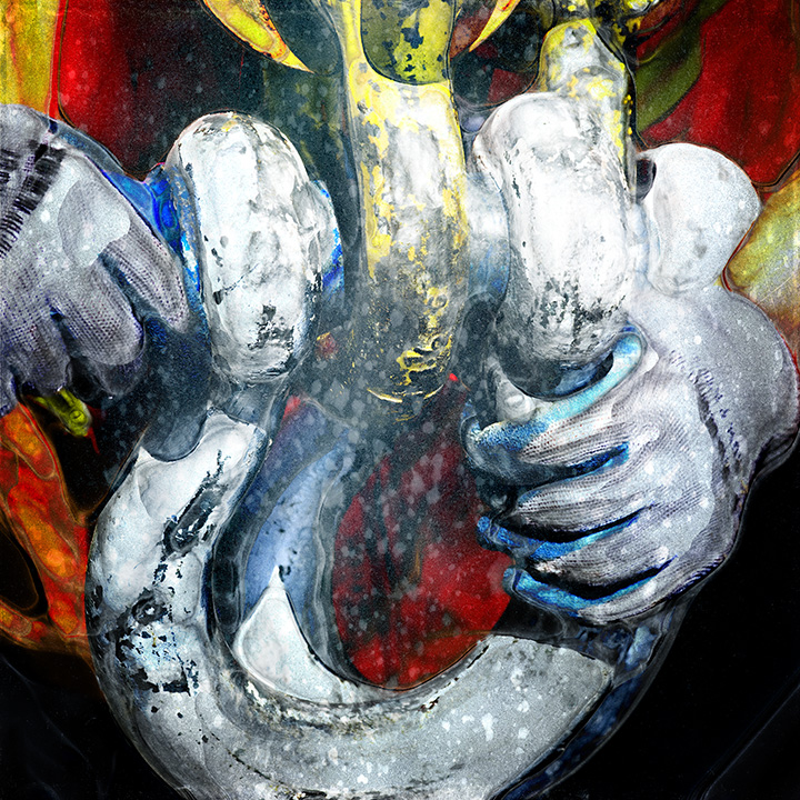 A contemporary colorful abstract painting with shackles being used in preparation for lift.